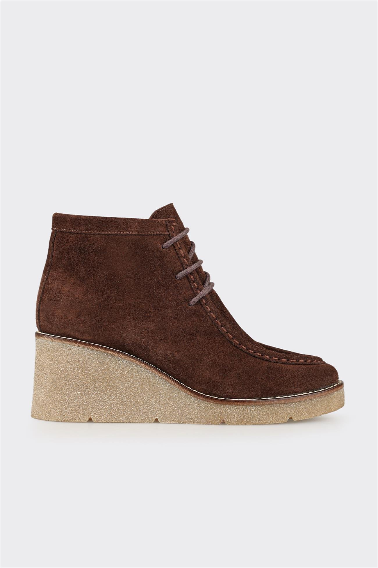 Koyu kahverengi süet malzemeden üretilen, bağcıklı ve kalın tabanlı şık bir kadın botu. Günlük kombinlerinizde ya da hafta sonu gezilerinizde rahatlığın ve tarzın tadını çıkarın.