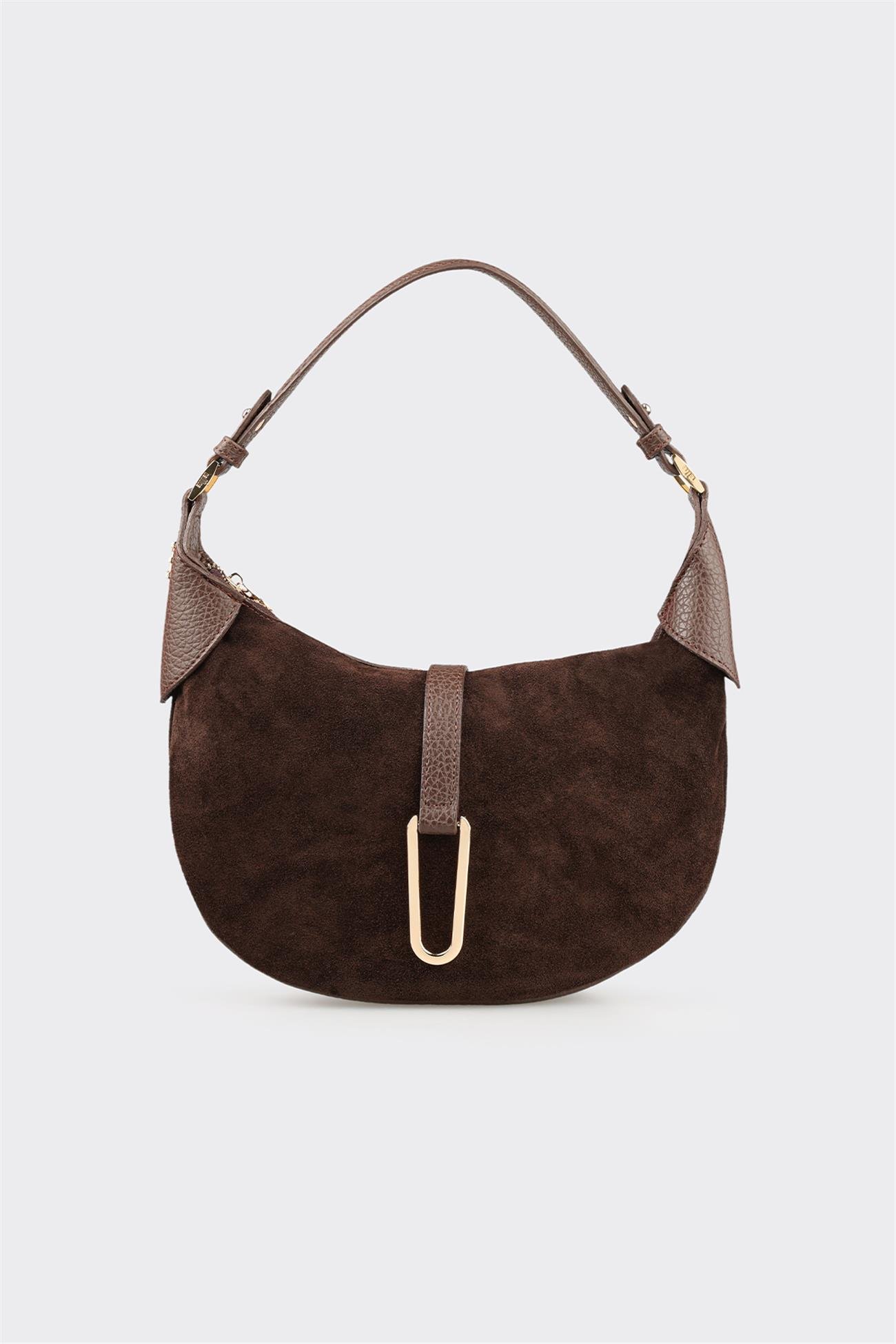 Elle Shoes'un kahverengi tonlarında, yumuşak Süet malzemeden üretilen el çantası, altın renkli metal detaylarıyla göz alıcı bir şıklığa sahip. Fermuarlı kapanması ve iç bölmeleriyle fonksiyonel bir kullanım sunan bu yarım ay formundaki çanta, günlük ve özel kombinleriniz için ideal bir tamamlayıcıdır.