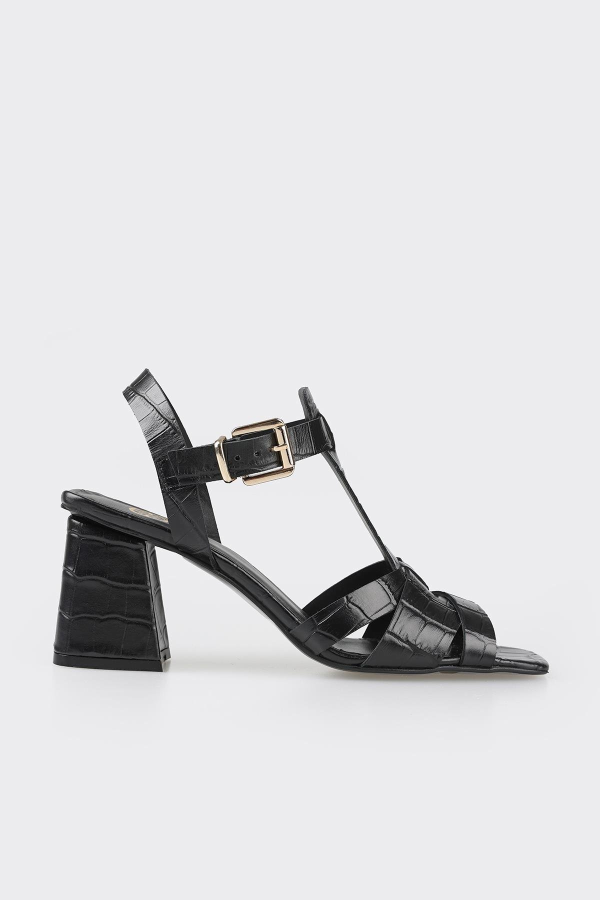 Krokodil dokulu deri topuklu sandalet feminen silüetinizi öne çıkartan bir tasarıma sahip. Klasik kombinlerinize çarpıcı bir dokunuş katmak için bu özel modeli kullanabilirsiniz.